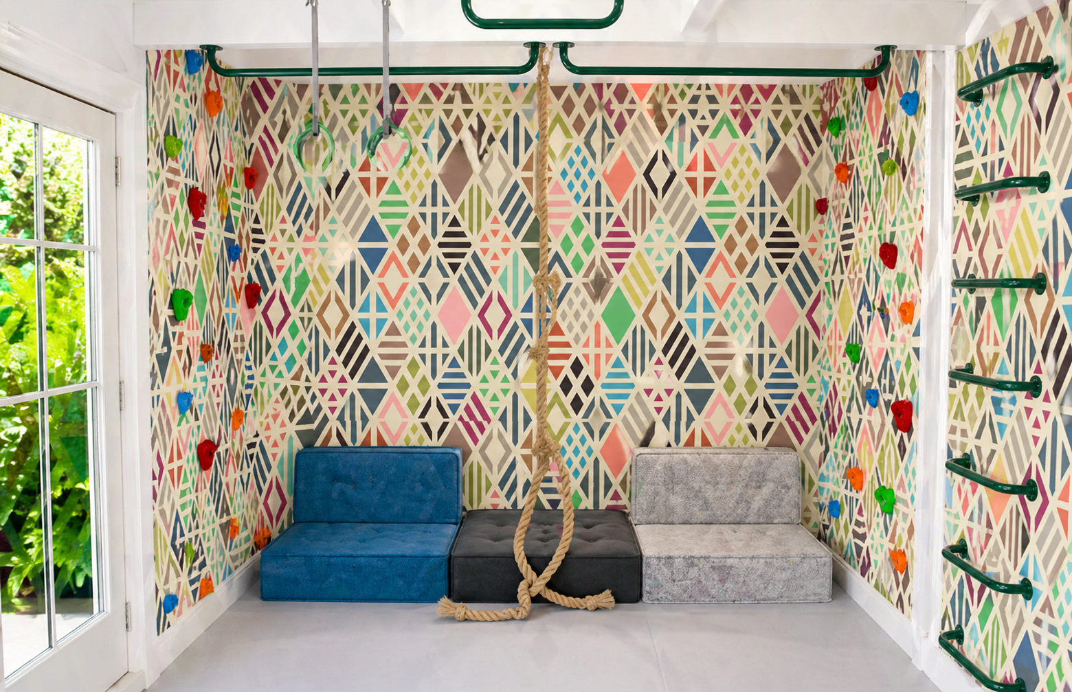 For a true statement wall, this wallpaper pairs beautifully with our screw-on rock wall holds in complementary tones, allowing you to create a climbing wall directly over wallpaper while maintaining a cohesive, designer aesthetic.