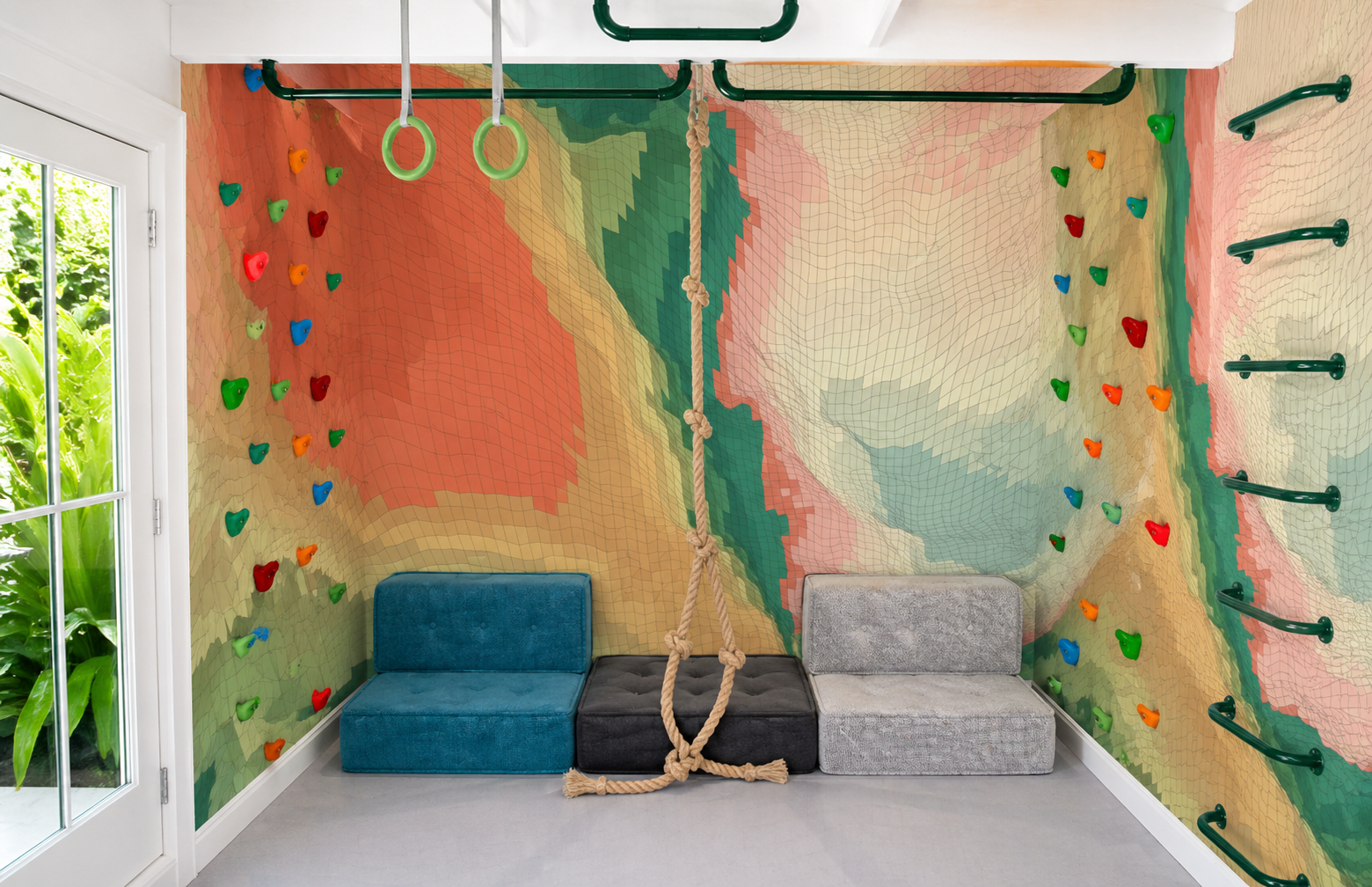 For a true statement wall, this wallpaper pairs beautifully with our screw-on rock wall holds in complementary tones, allowing you to create a climbing wall directly over wallpaper while maintaining a cohesive, designer aesthetic.