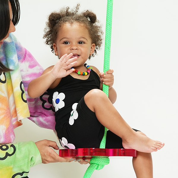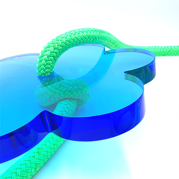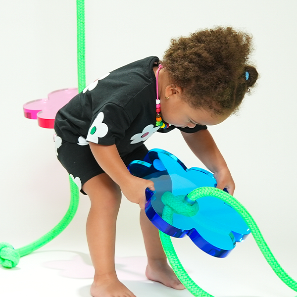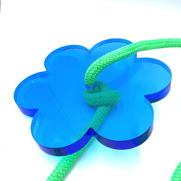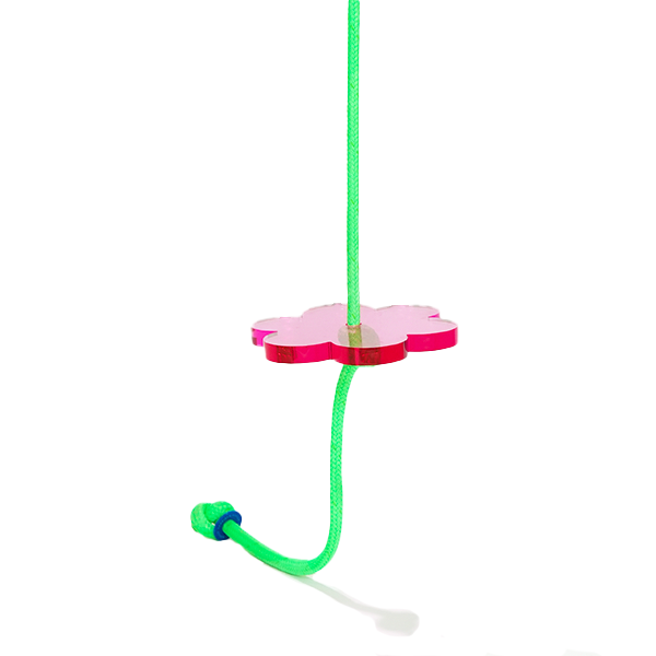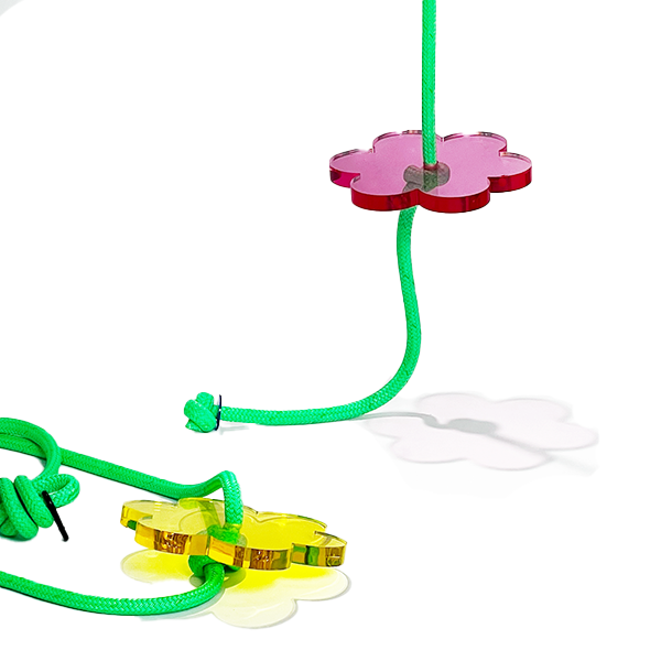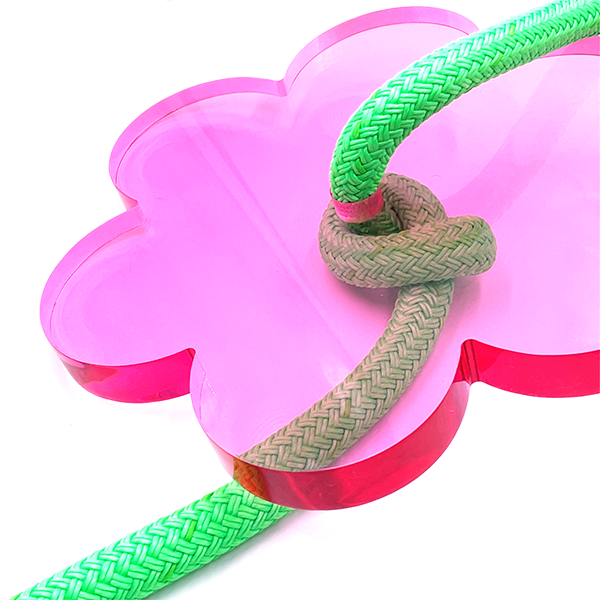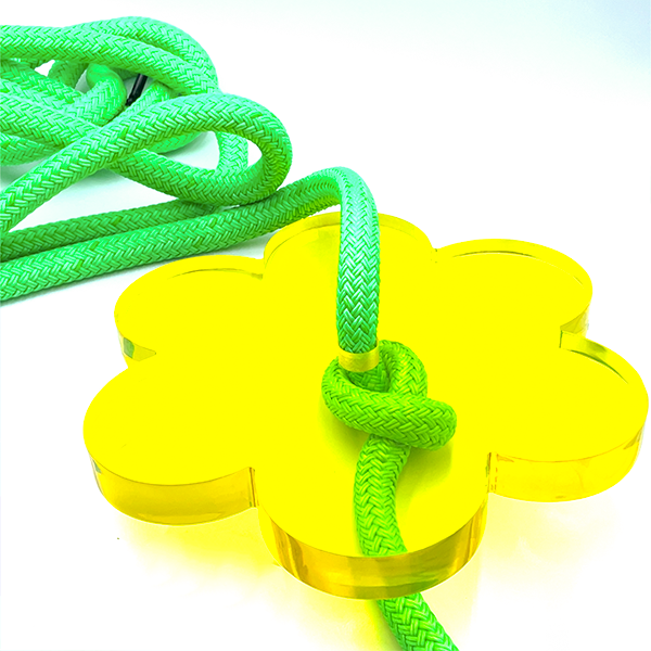 Brightness all around! Inspired by spring-time blossoms, this cute and compact stylish design makes it easy to add a pop of color to any space in your house. Sit or stand on the hand polished acrylic flower seat and give the bright green rope a hug!